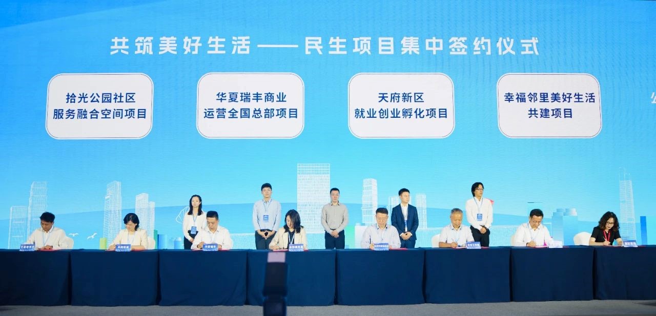 产业与民生并重,大会现场举行了幸福邻里美好生活共建项目、华夏瑞丰商业运营全国总部项目、拾光公园社区服务融合空间项目、天府新区就业创业孵化项目等9个产业及民生领域重点项目签约仪式,共涉及社会公共服务、创业孵化、卫星互联网、人工智能、商贸文创等多个领域,以实实在在的项目落地支撑高质量发展与高品质生活的目标实现。