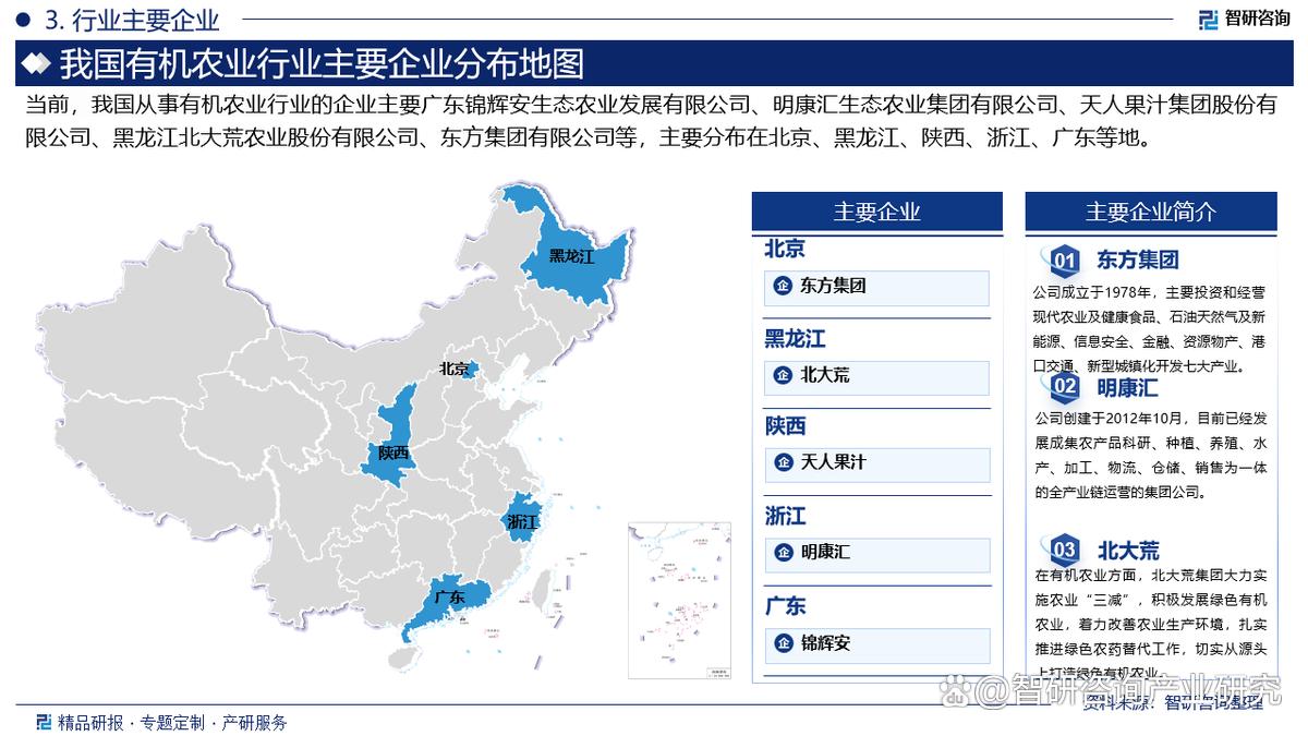 随着消费者对有机产品的认知和需求不断提升,有机农业市场逐渐扩大,吸引了越来越多的企业进入。从市场参与者看,国内尚未形成大型综合性有机农业企业,多数企业专注于有机农业某个子行业,有机农业市场企业格局整体呈现小而散分布。目前,行业内相关企业主要包括广东锦辉安生态农业发展有限公司、明康汇生态农业集团有限公司、天人果汁集团股份有限公司、黑龙江北大荒农业股份有限公司、东方集团有限公司等。