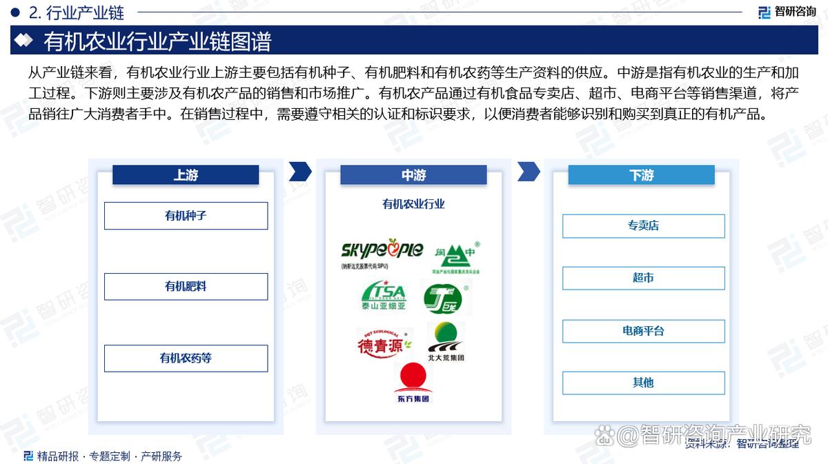 从产业链来看,有机农业行业上游主要包括有机种子、有机肥料和有机农药等生产资料的供应。中游是指有机农业的生产和加工过程。下游则主要涉及有机农产品的销售和市场推广。有机农产品通过有机食品专卖店、超市、电商平台等销售渠道,将产品销往广大消费者手中。在销售过程中,需要遵守相关的认证和标识要求,以便消费者能够识别和购买到真正的有机产品。